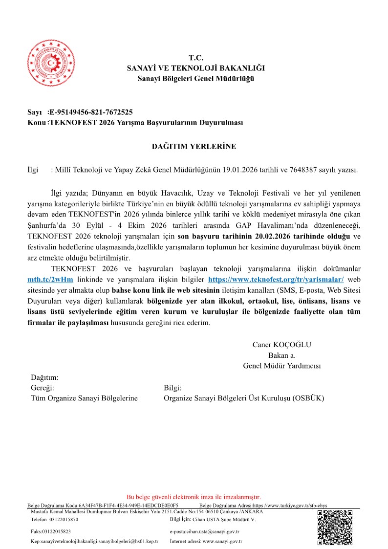 TEKNOFEST 2026 ve başvuruları başlayan teknoloji yarışmalarına ilişkin dokümanlar mth.tc/2wHm linkinde ve yarışmalara ilişkin bilgiler https://www.teknofest.org/tr/yarismalar/ web sitesinde yer almaktadır.